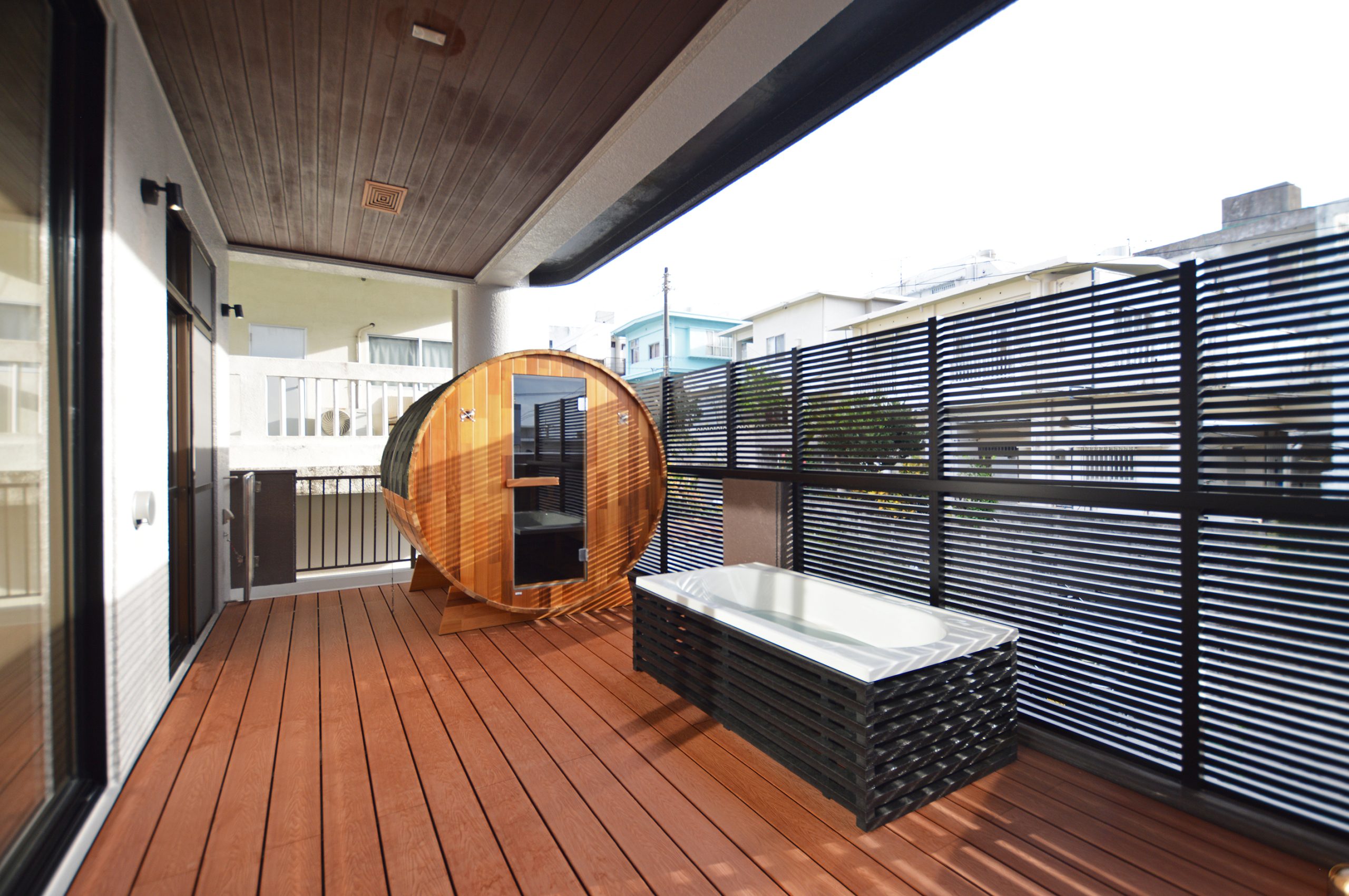 さらに、外のバルコニーにはウッドデッキを敷いてサウナも設置。